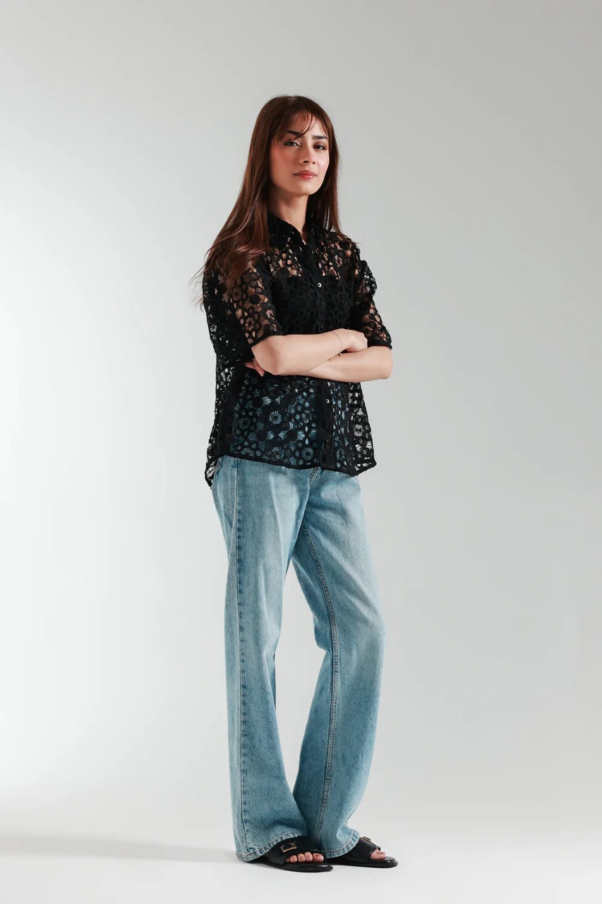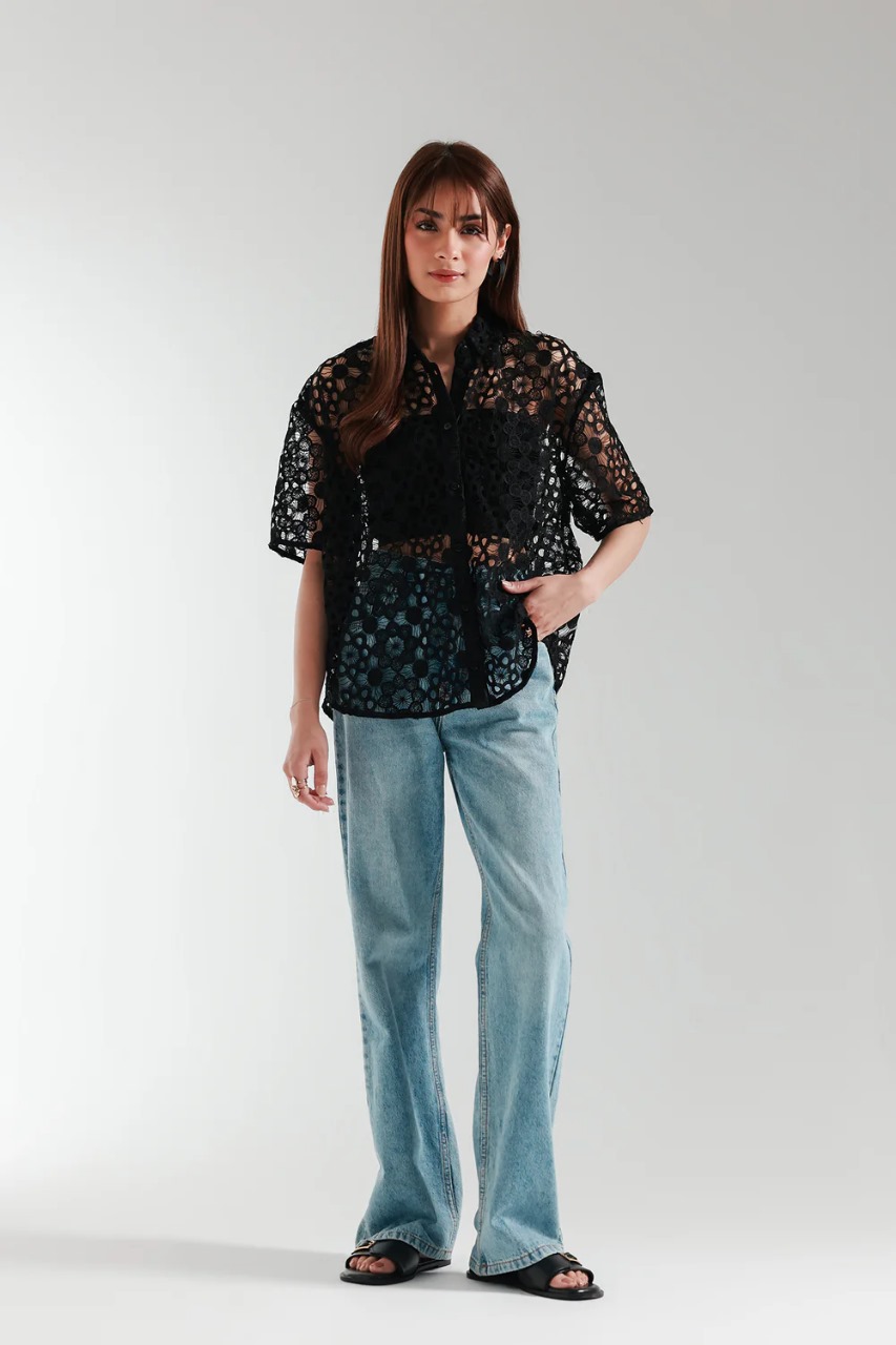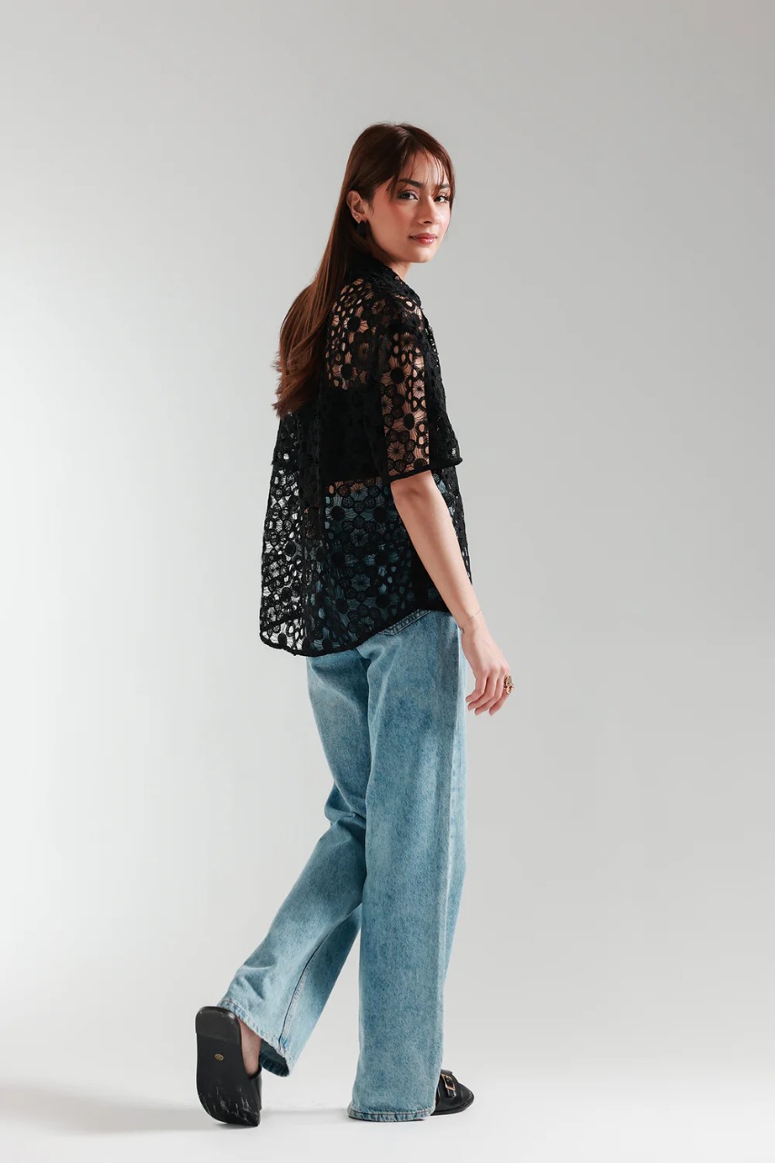 A gracefully elegant top crafted in a contemporary loose fit button down silhouette. Illustrating a mesmerizing deep black color and beautifully adorned with cutwork net fabric, this contemporary yet sassy top is a trendy option for fun gatherings this spring season.