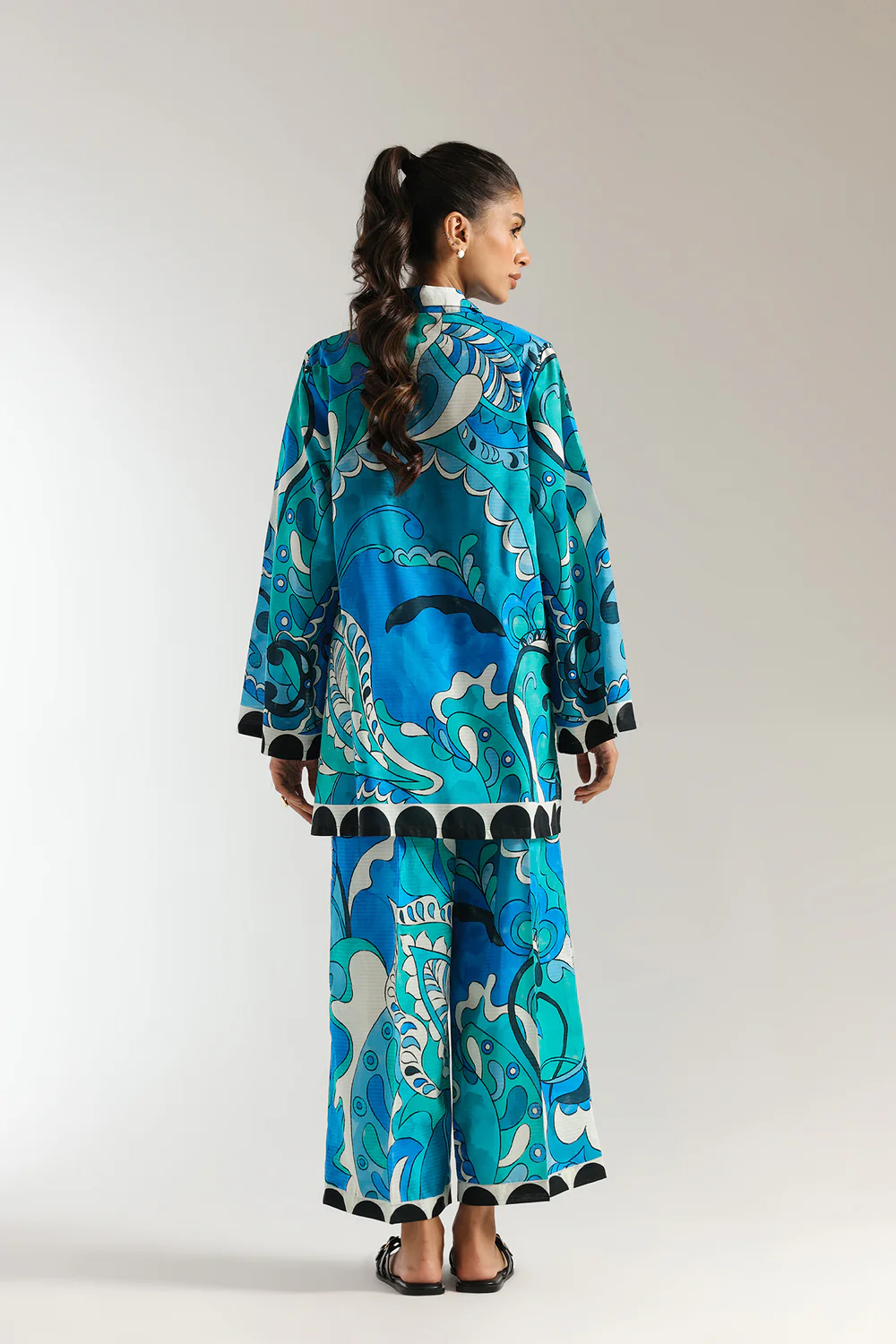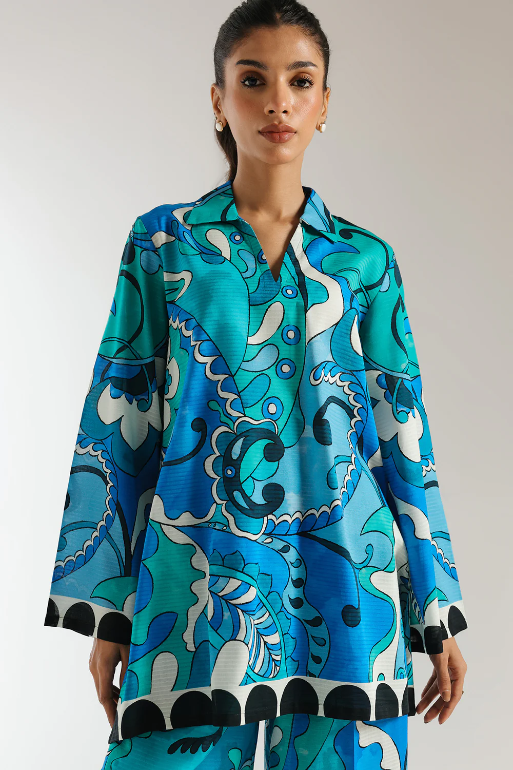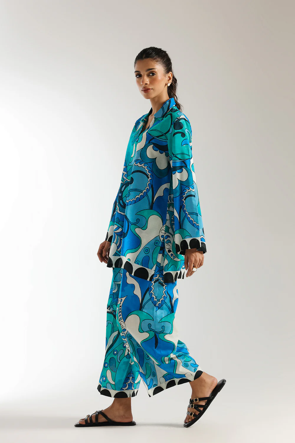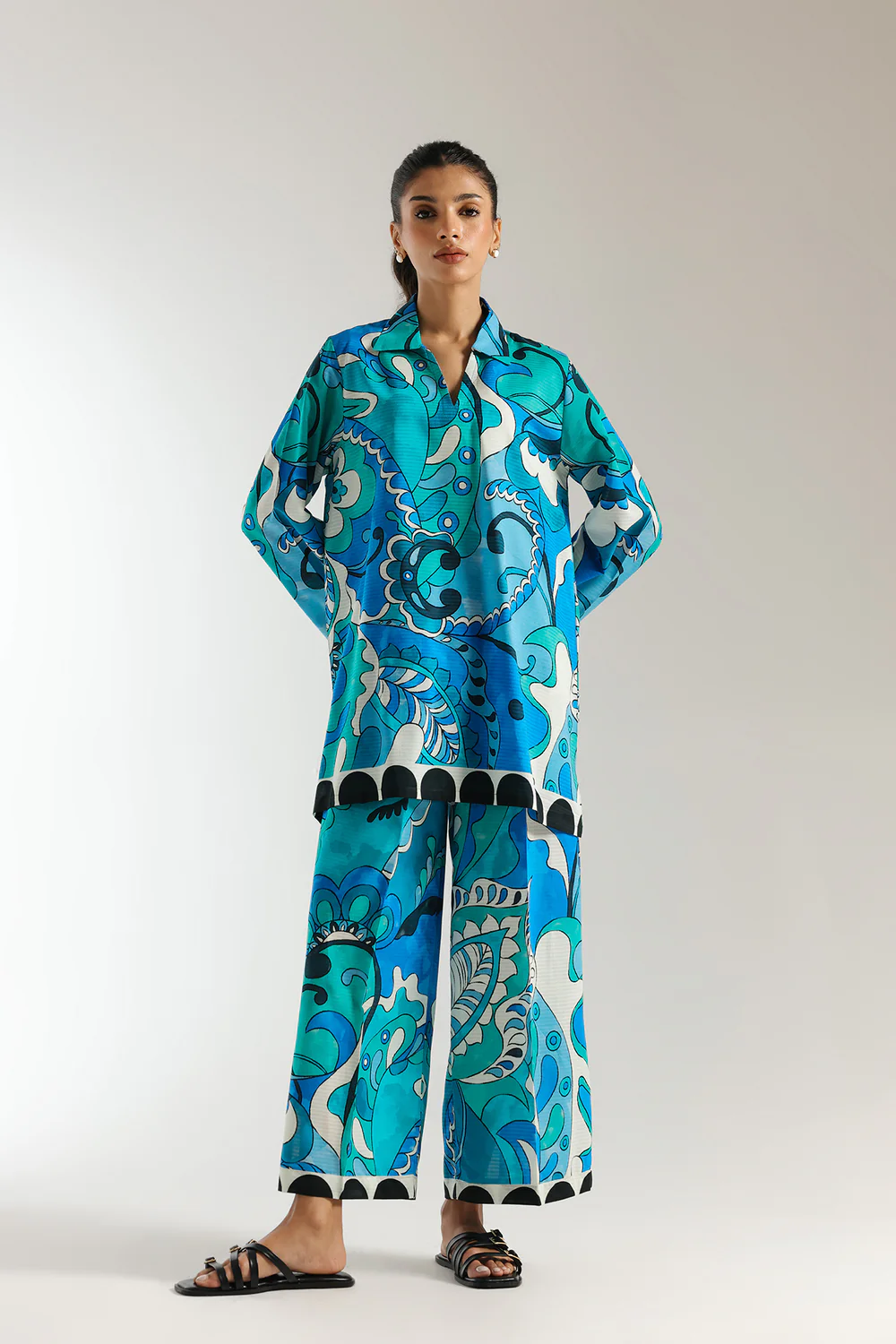 "Women's blue-green co-ord set with artistic multicolor print – short A-line shirt and straight culotte trousers in cotton blend" Blue-Green Artistic Print Co-o...