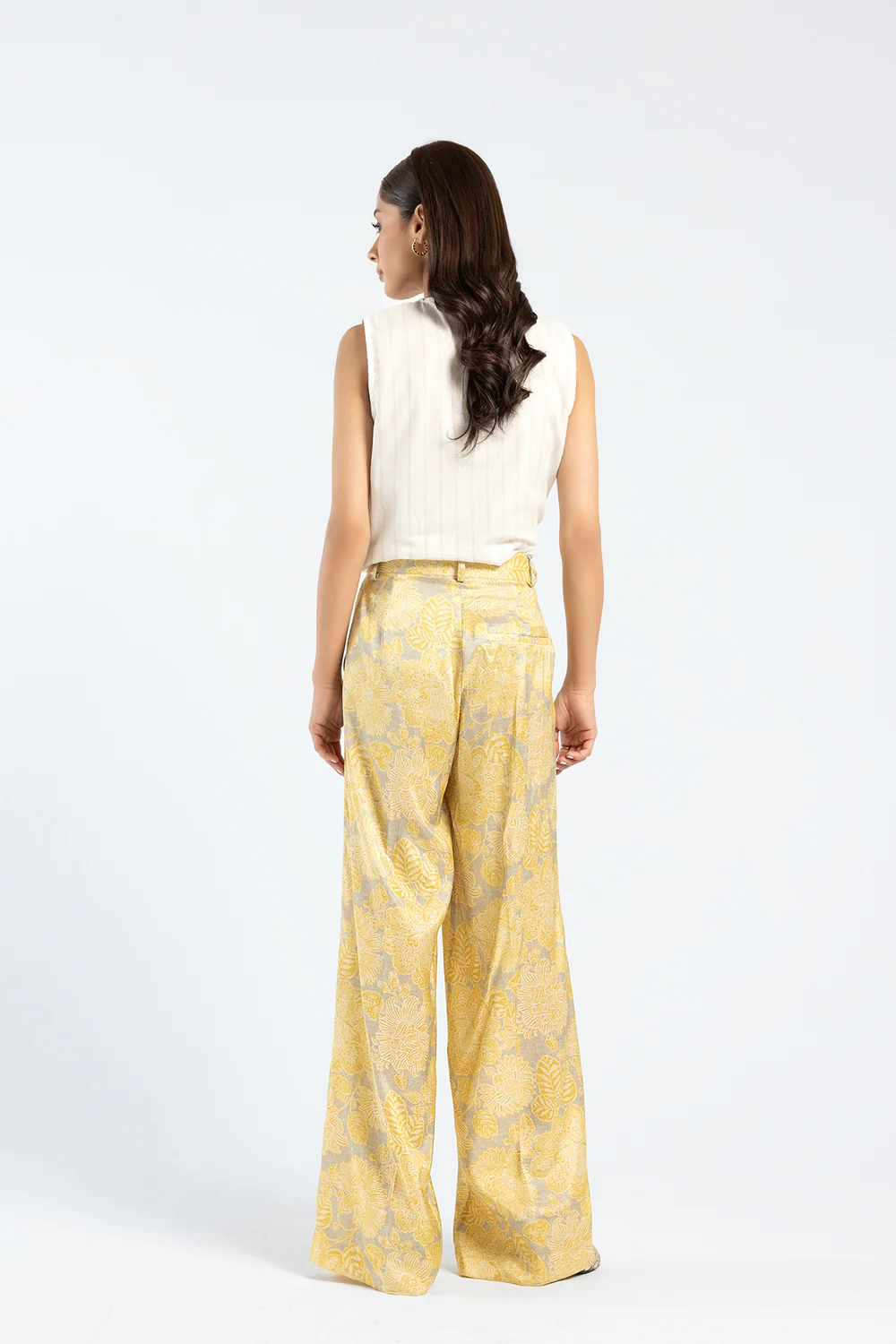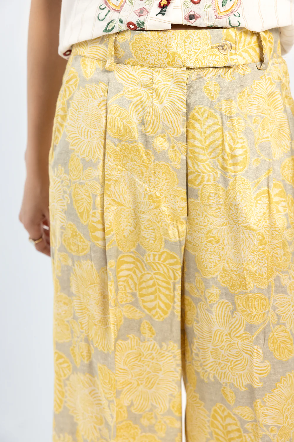 Style like a diva this happening season in this contemporary silhouette trouser rendered in a gleaming bright yellow color and adorned with floral prints in vibrant hues. Illustrating an experimental design with a flared silhouette, style this trendy trouser at fun parties and embrace the classy look.