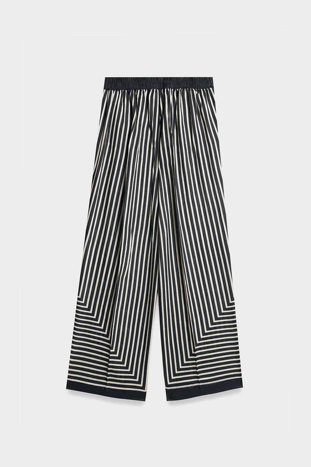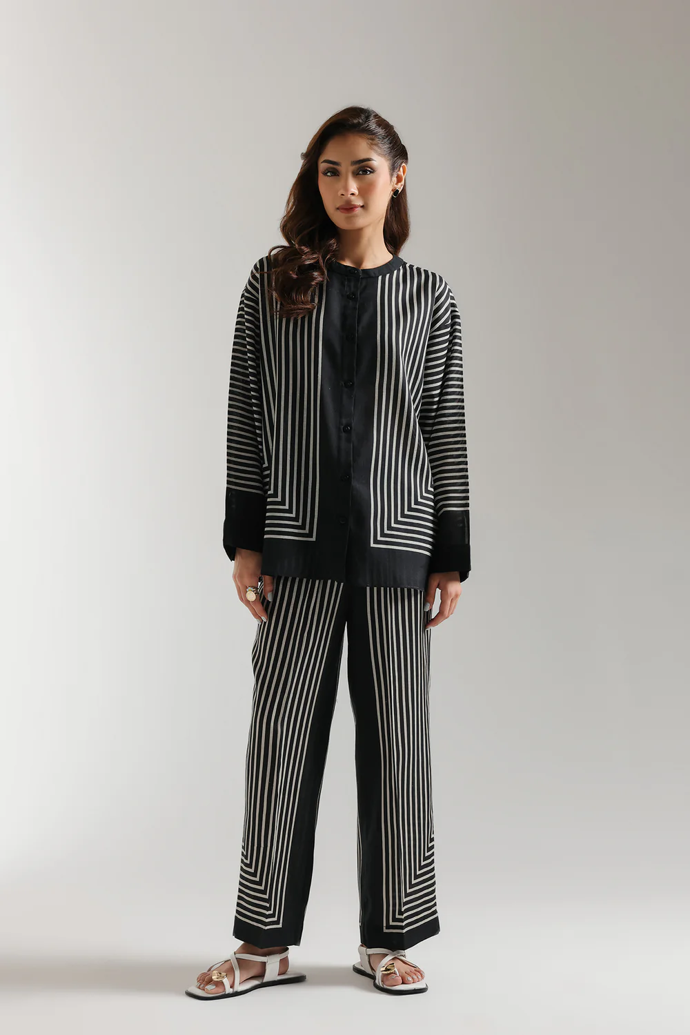 Introducing the stunning grey shade outfit. This contemporary ensemble boasts a mesmerizing striped design in a bold black hue illustrating geometric square shapes. Crafted with a trendy button down top and matching straight pants, this outfit exudes elegance. Perfect for fun gatherings, make a statement with this monochromatic must-have.