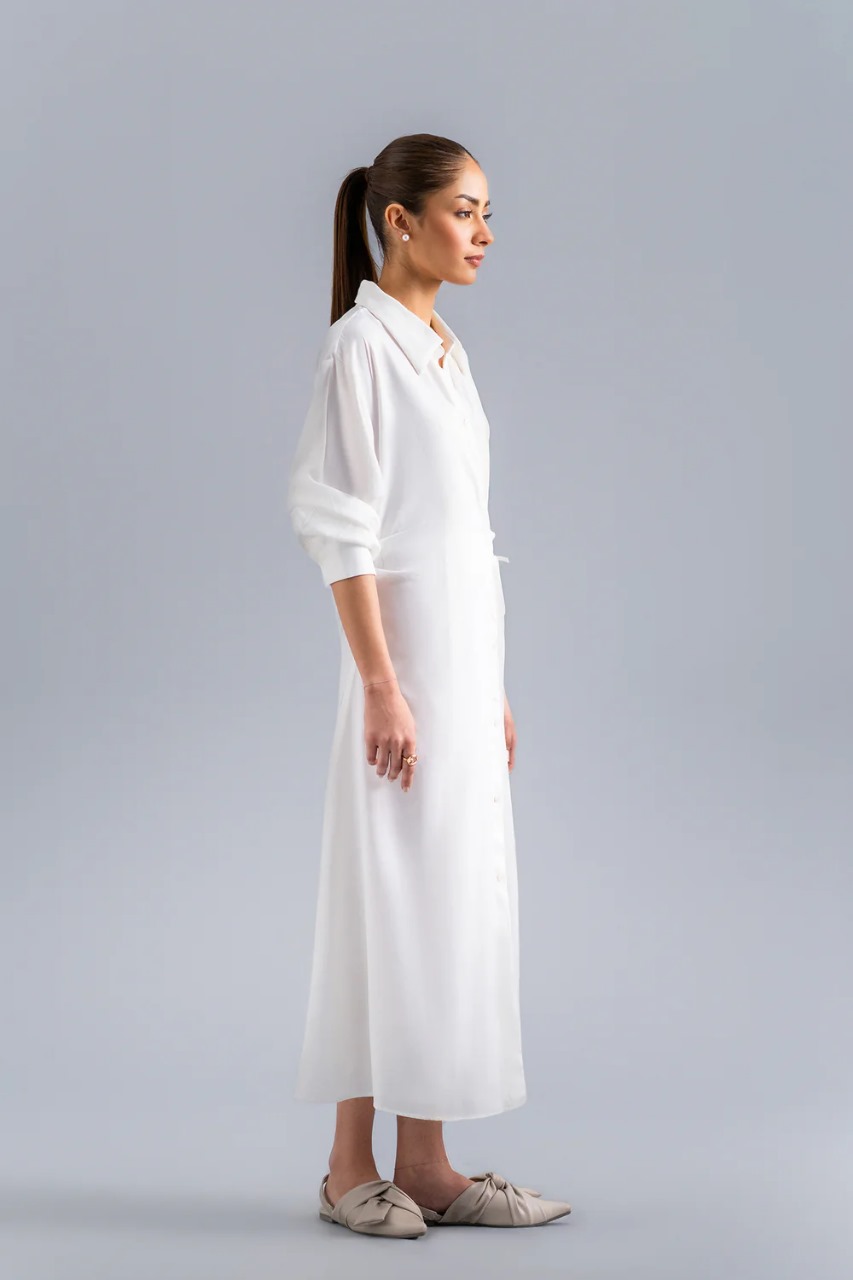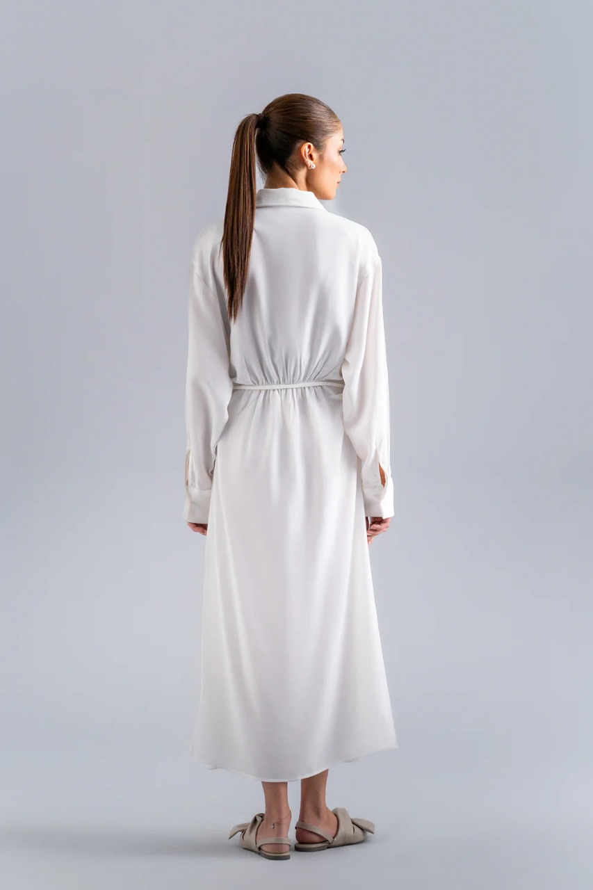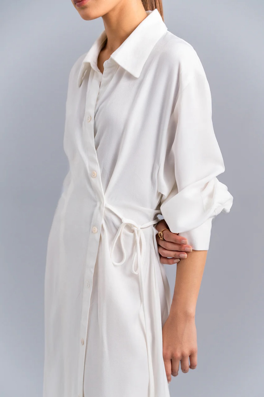 This graceful dress is the perfect statement piece for any fun event. Crafted in a trendy button down silhouette with a drawstring knot tie side waist. Rendered in a creamy off white color illustrating a contemporary look .Wear it at day events this season and it’s a must-have for any fashionista.