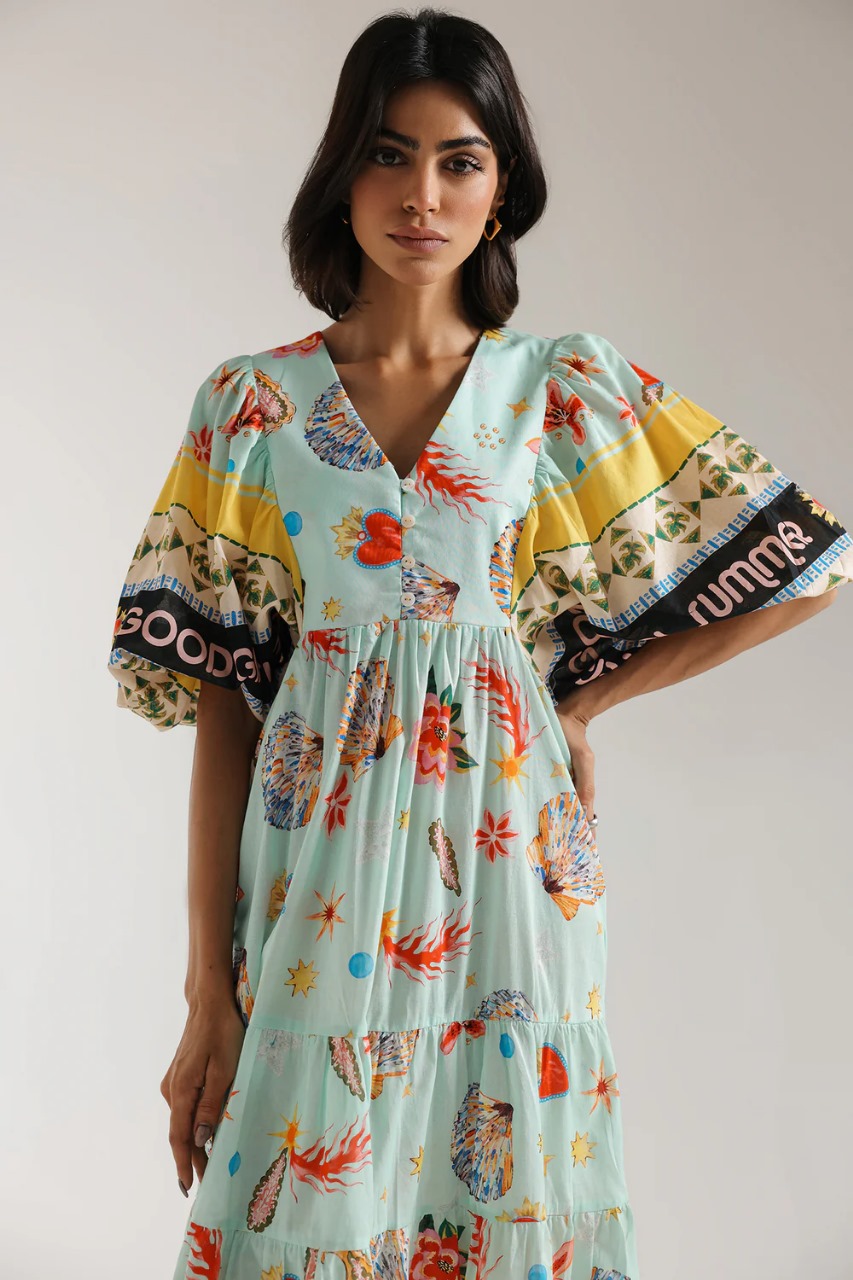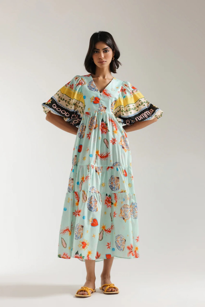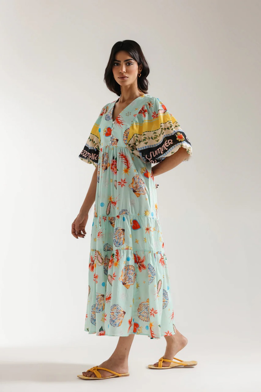 Indulge in sophistication with a modern twist in this graceful green dress, featuring a flattering waist with gathers below and enhanced with vibrant floral prints. Perfect for any summer occasion, this dress effortlessly combines style with comfort for a chic look.