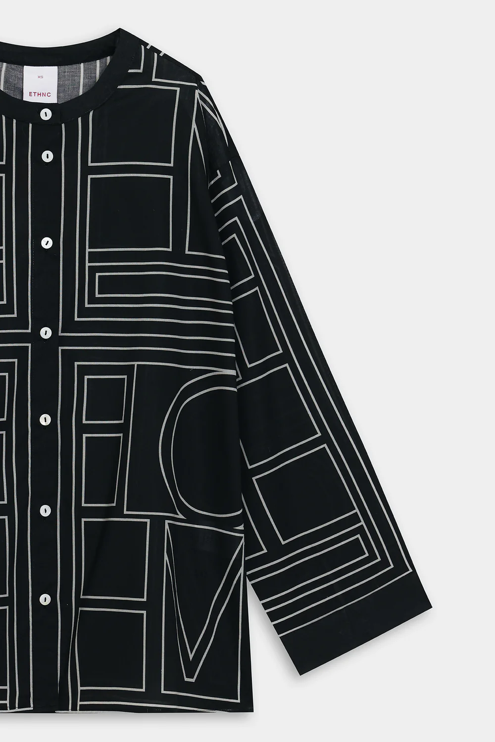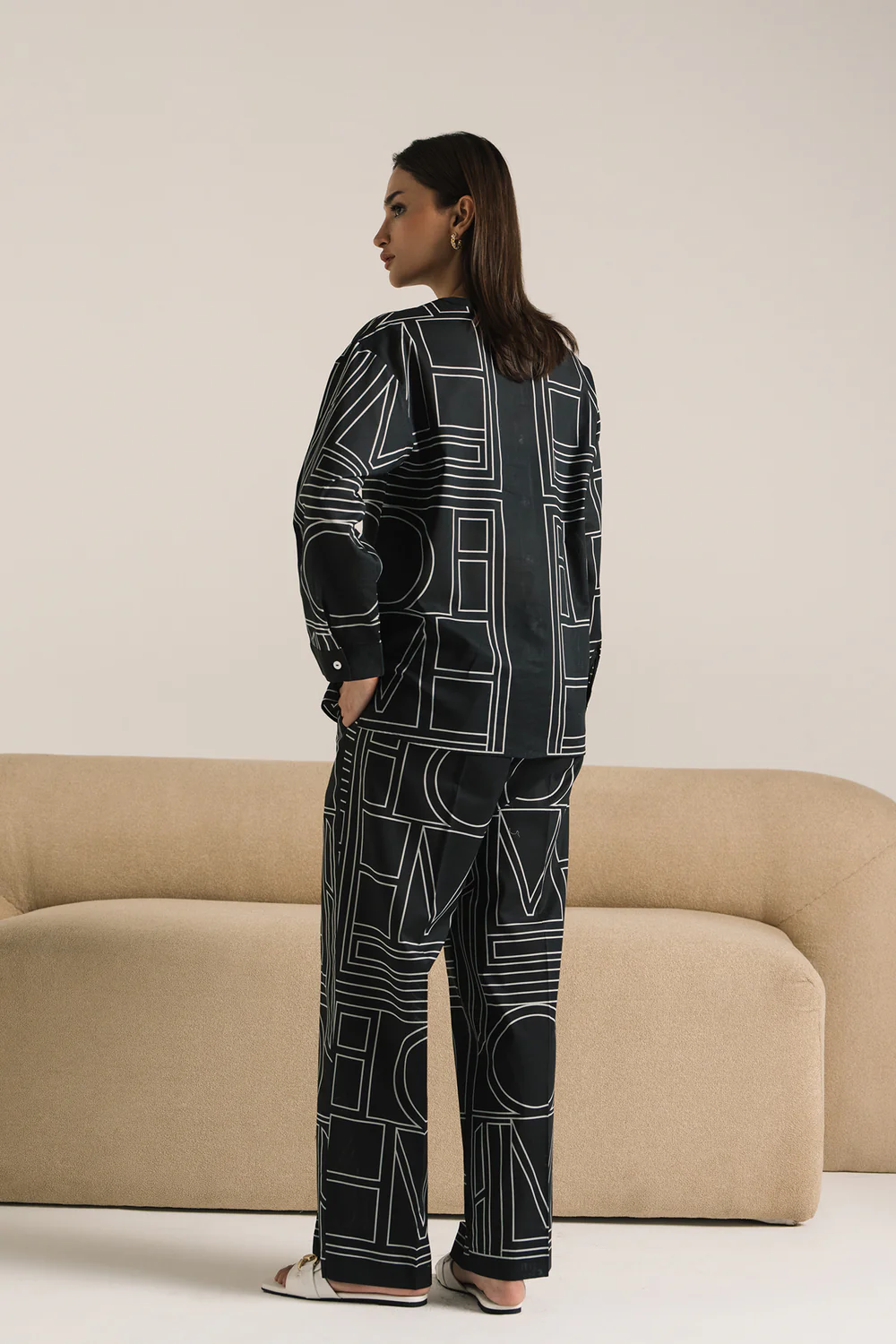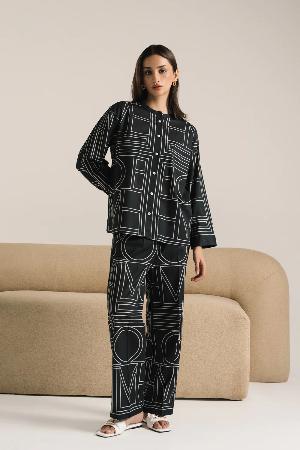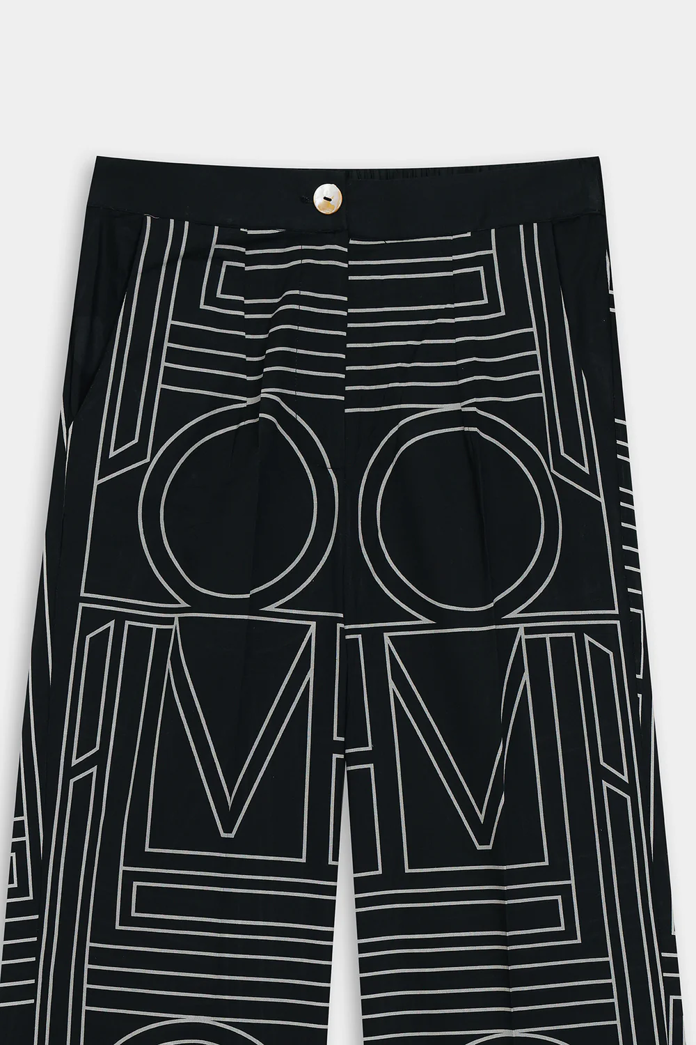A striking work of art is depicted on this modern outfit, presented in a deep black hue and displaying a geometric patterned design in contrasted white color. It showcases a stylish top designed in a sophisticated button-down style with a ban neckline. Paired with complementing straight pants, this refined ensemble is perfect for social gatherings and events this season.
