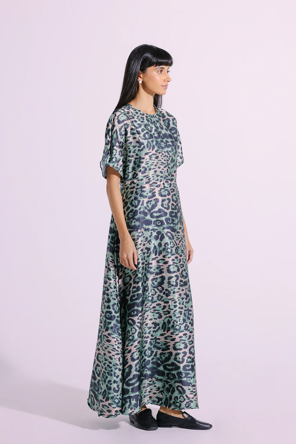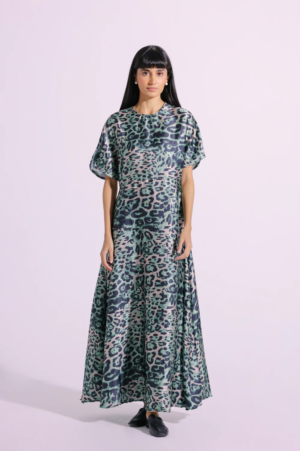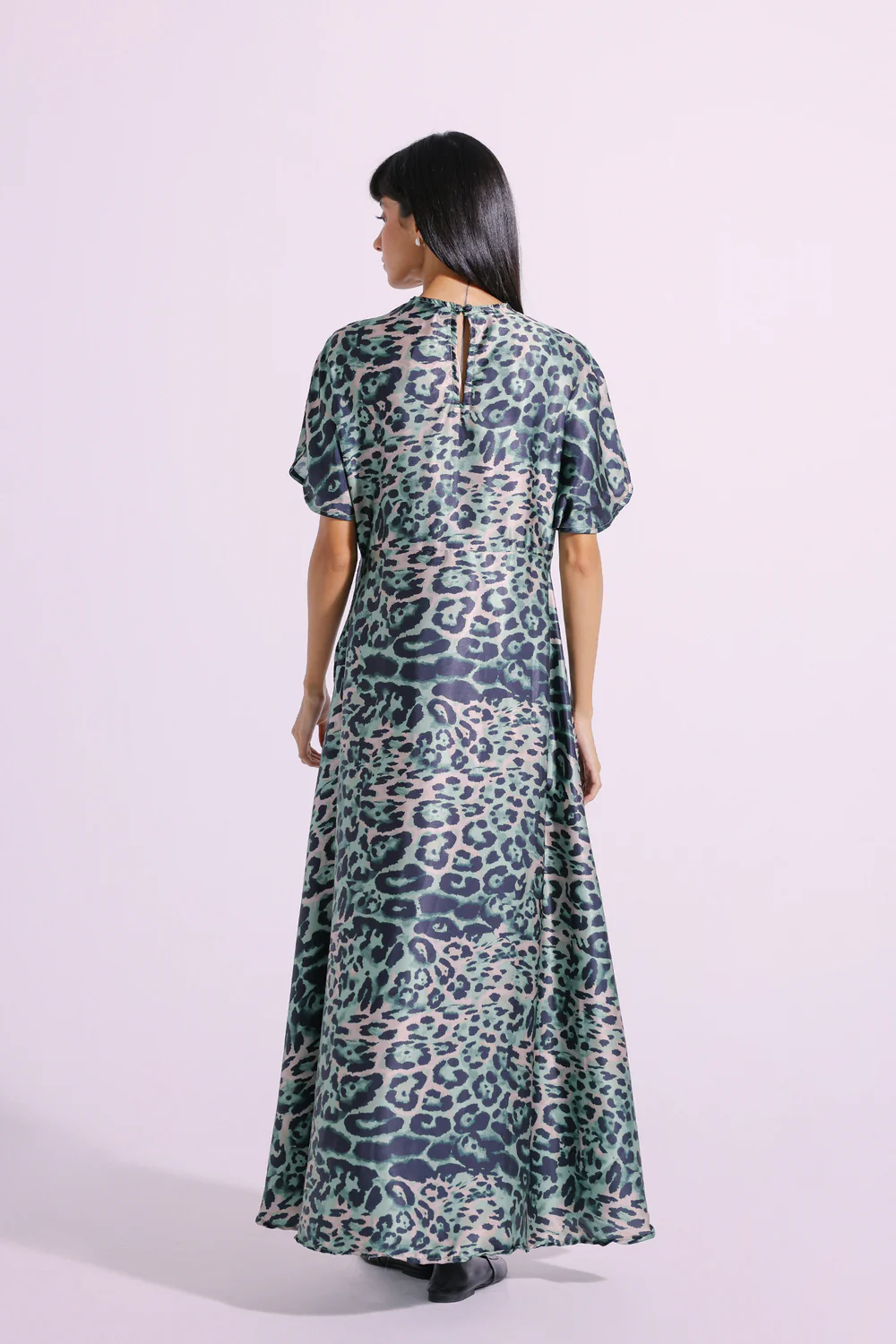 A gracefully elegant composition is layered over this trendy dress rendered in a grass green shade. Crafted in an elongated silhouette, this flowy dress is enriched with captivating animal pattern printed in vibrant hues. Style this classy dress at fun parties and be the epitome of grace this season.